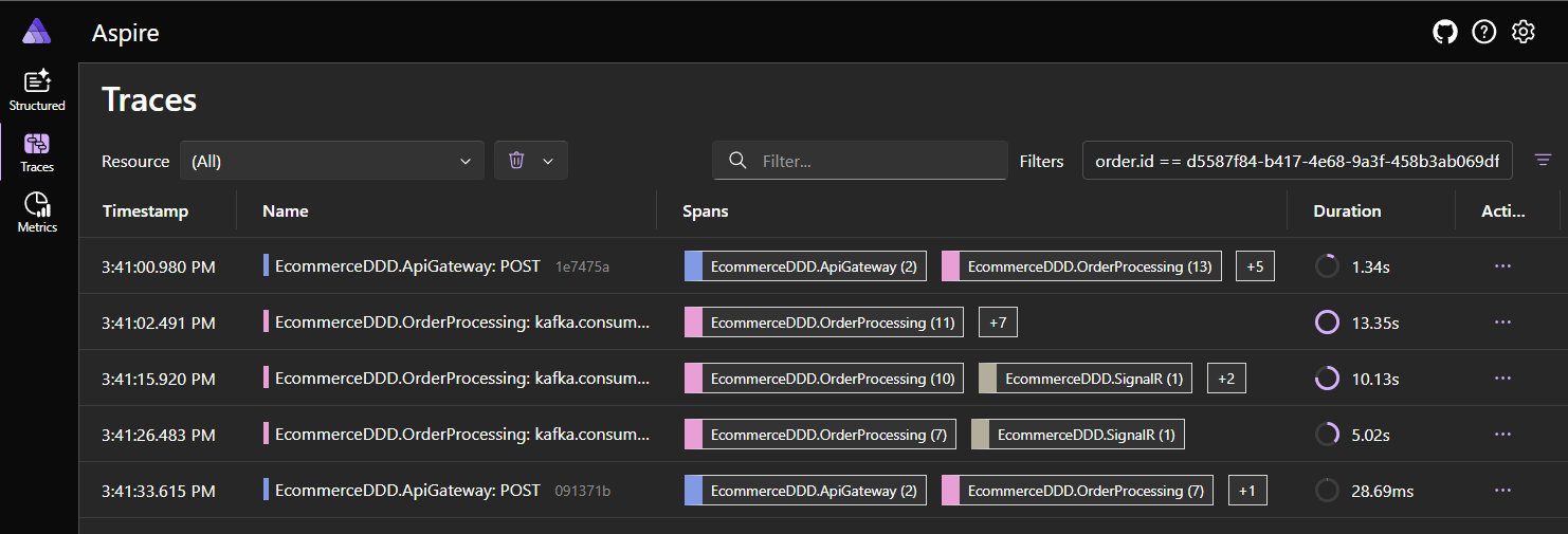 In the Aspire Dashboard you can filter the trace list by order.id:equals:{guid} to find every trace that touched a specific order, across all services. Each service’s command spans carry this tag because every command that handles an order-scoped operation implements ITraceable.
